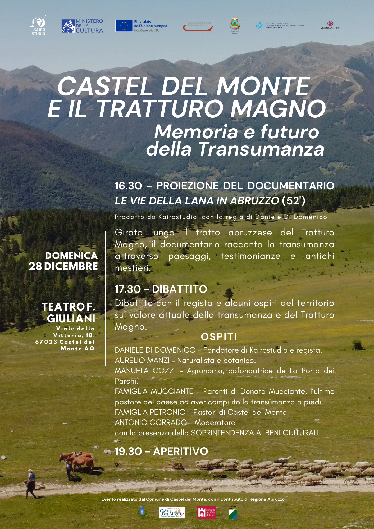 L’evento nasce con l’obiettivo di valorizzare la transumanza e il ruolo storico del Tratturo Magno, una delle più importanti vie pastorali d’Italia, che per secoli ha modellato paesaggi, economie e relazioni tra le comunità dell’Appennino. Castel del Monte, luogo simbolico del ritorno transumante e cuore del racconto abruzzese, diventa così lo spazio ideale per presentare il documentario al pubblico.